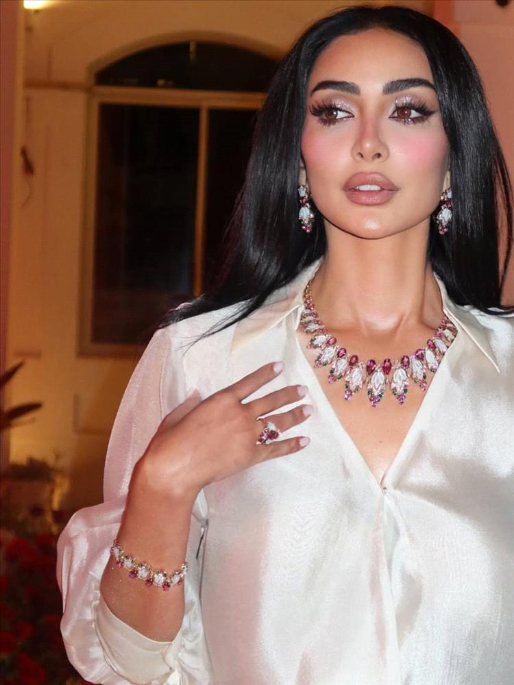 الماس أضاف لمسة فاخرة، بينما أكمل الياقوت الوردي لوحة الألوان الهادئة، ليمنح اللوك طابع أنثوي برّاق يعكس أجواء الاحتفال.