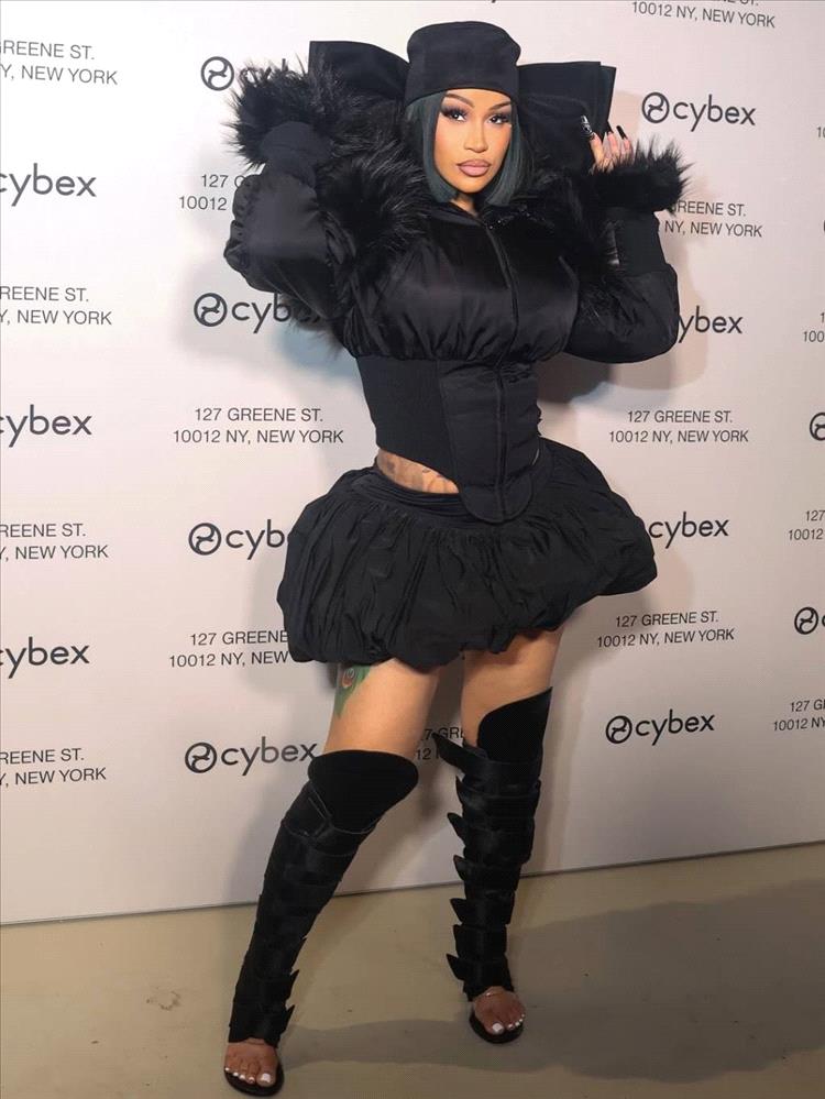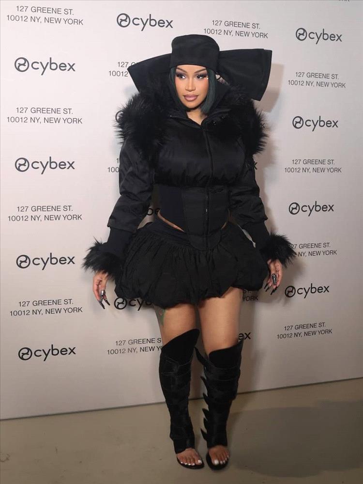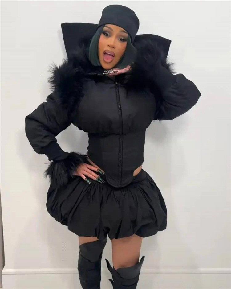 وفي أول ظهور لها منذ استقبالها لطفلها الرابع، اختارت مغنية الراب طقمًا أسود كاملًا من الرأس إلى القدمين، تضمّن سترة منفوخة قصيرة مع مشد للخصر. وأكملت إطلالتها بتنورة قصيرة ذات حافة منتفخة، وحذاءً مفتوحًا من الأمام، وقبعة عريضة بتصميم هندسي مزينة بفيونكة كبيرة من الخلف.
