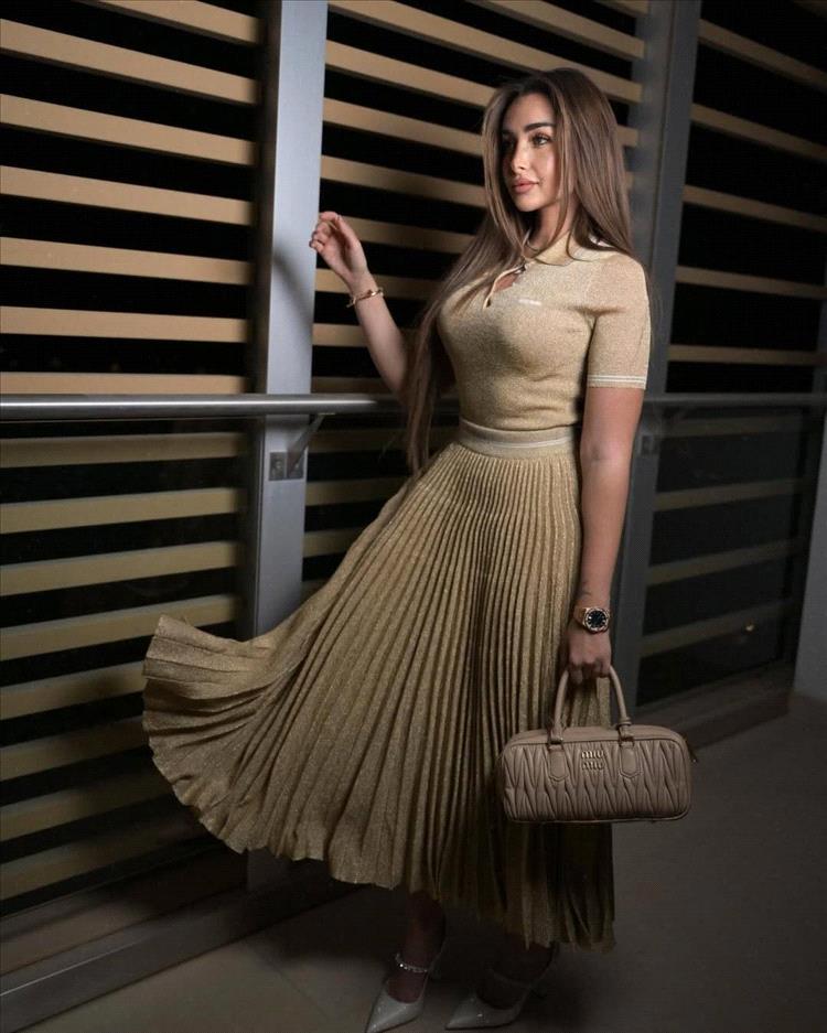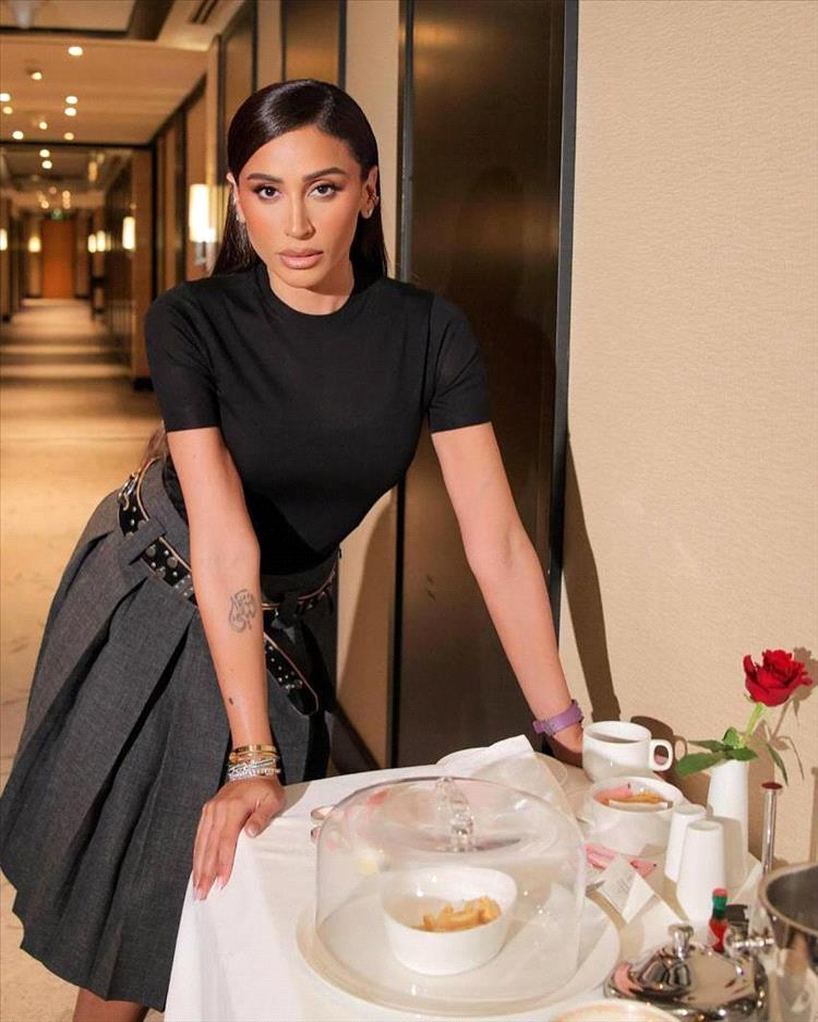 ساعة هنا تجمع بين الرقّة والقيمة العالية، وتعكس الذوق الهادئ الذي يطغى على إطلالاتها.