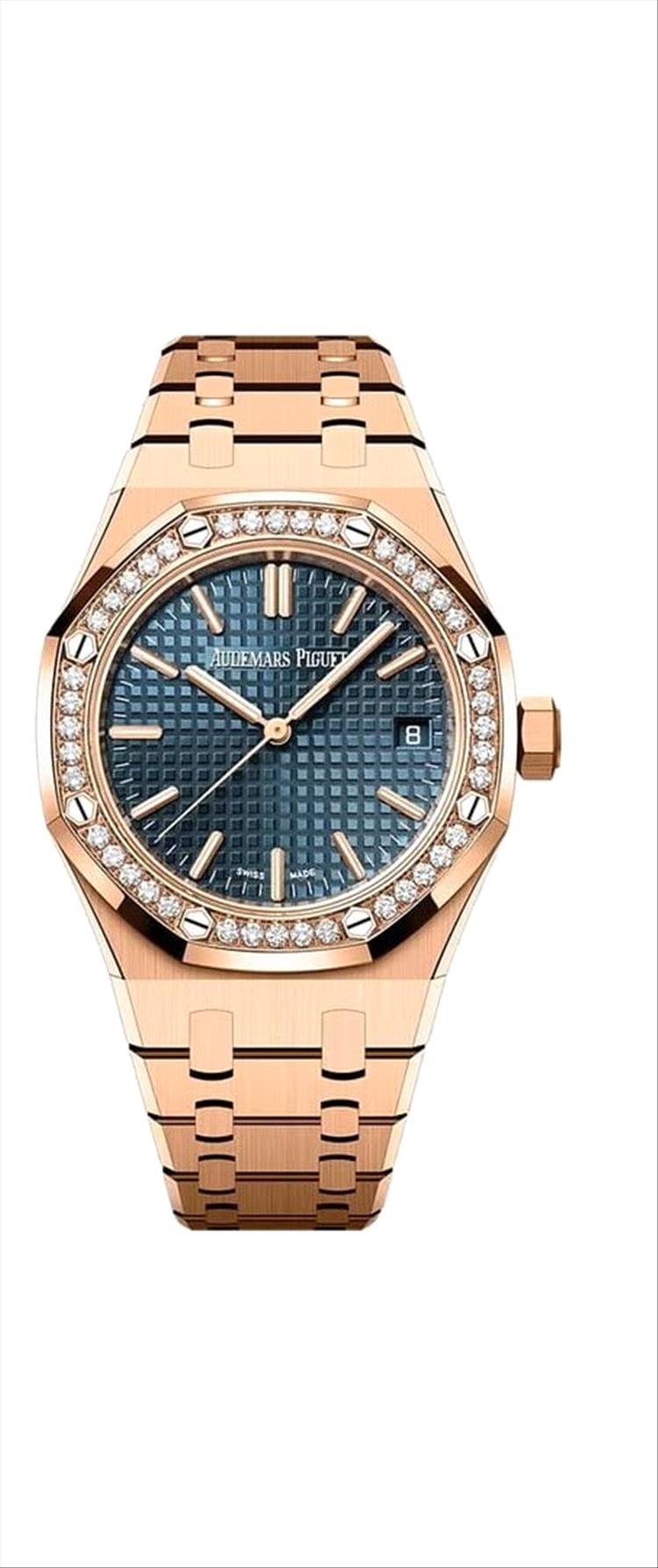 هنا الزاهد تميل دائماً إلى الإطلالات الأنثوية الراقية، وقد ظهر ذلك جلياً في الساعة التي اختارتها من مجموعة Royal Oak. الساعة بقياس 37 مم وبحركة أوتوماتيكية، تأتي بهيكل من الذهب الوردي عيار 18 قيراطاً، مع إطار مرصّع بالألماس يضيف بريقاً هادئاً يناسب أسلوبها الناعم. أما المينا الأزرق فيمنحها طابعاً ملكياً جذاباً، وتأتي العقارب المصنوعة من الذهب الوردي لإكمال هذا التناسق الدافئ. يكتمل التصميم بسوار من الذهب الوردي، فيما تضم الحركة الداخلية 29 حجراً كريماً مصنّعاً واحتياطي طاقة يصل إلى 60 ساعة.