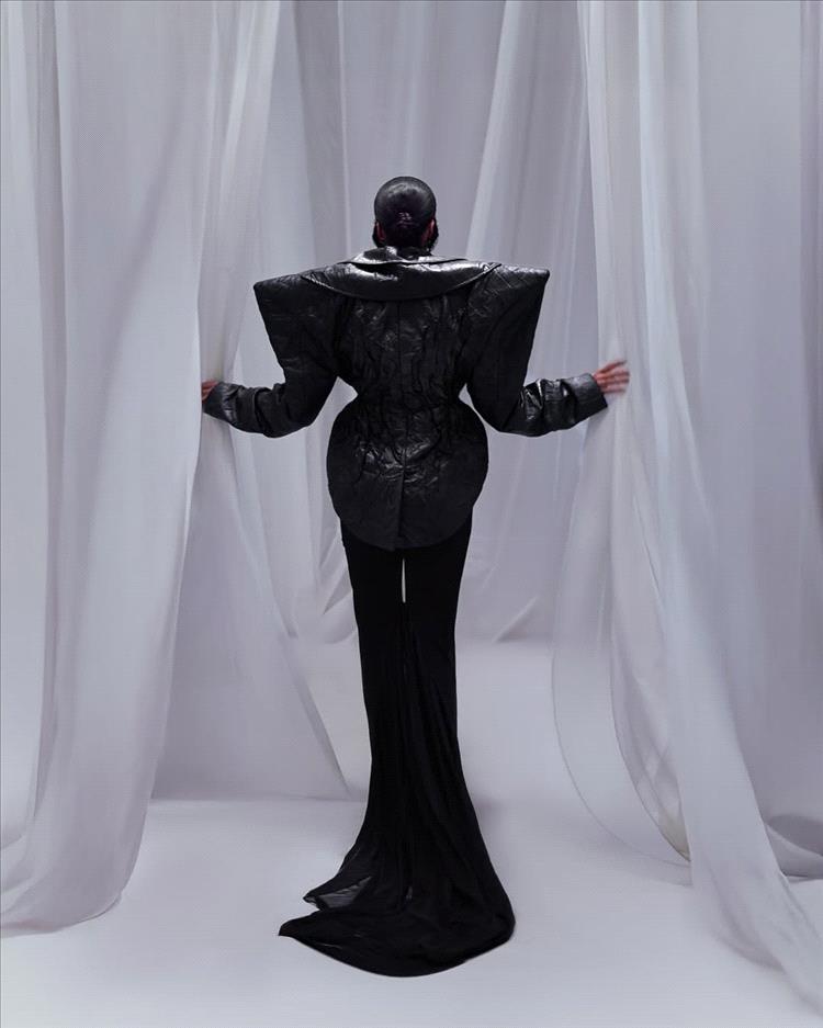 واختارت النجمة المصرية إطلالة غير تقليدية وجريئة لناحية التصميم، وهو عبارة عن فستان طويل مجسّم من الشيفون مع ذيل يمتد خلفها على الأرض، ونسّقت معه جاكيت من الجلد بتصميم هندسي غريب، فجاءت السترة بأكتاف عريضة جداً وبارزة، وهو ما منحها إطلالة دراماتيكية غريبة وغير مألوفة.