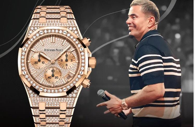 ورُصد النجم المصري خلال حفل تكريم مكتشفه الموسيقار هاني شنودة وهو يرتدي ساعة من Audemars Piguet مصنوعة من الذهب الأبيض عيار 18 قيراطاً مع إطار ملوّن من باغيت الماس، وتحتوي حركة الساعة على 38 حجراً كريماً. ويتخطّى سعر الساعة الـ 655 ألف دولار أميركي.
