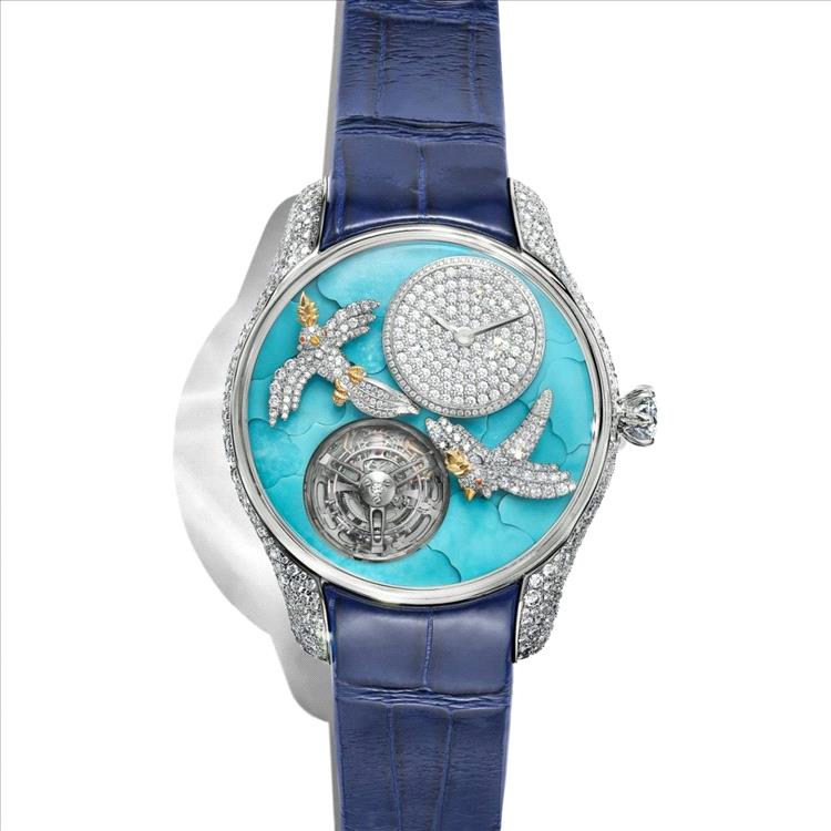 تحتفي ساعة "بيرد أون أ روك"، وهي جزء من مجموعة جان شلومبرجيه من "تيفاني"، بأحد أكثر إبداعات الدار أيقونيةً. إذ يستقرّ الطائر المرصّع بالألماس فوق حلقة من الأحجار الكريمة تدور مع كل حركة من المعصم، في رمزٍ للتناغم الكامل بين عالمَي المجوهرات وصناعة الساعات. ويبلغ هذا التآلف الإبداعي آفاقاً جديدة مع "بيرد أون أ فلاينغ توربيون"Bird On a Flying Tourbillion، التي قُدِّمت في العام 2024 وتضمّ أول حركة توربيون طائر من "تيفاني"، في تحفةٍ تجمع بين فن ترصيع الأحجار الكريمة، ونحت الذهب، وترصيع الألماس، لتشكّل فصلاً حاسماً في تطوّر الدار نحو عالم الساعات الراقية. ويشهد هذا العام أيضاً إطلاق مجموعة "بيرد أون أ روك ليغاسي" Bird On a Rock Legacy، التي تُقدَّم بموانئ من عرق اللؤلؤ المنقوش وأحجار كريمة اكتشفتها أو أدخلتها إلى العالم دار "تيفاني"، بما في ذلك المورغنايت والتنزانيت.