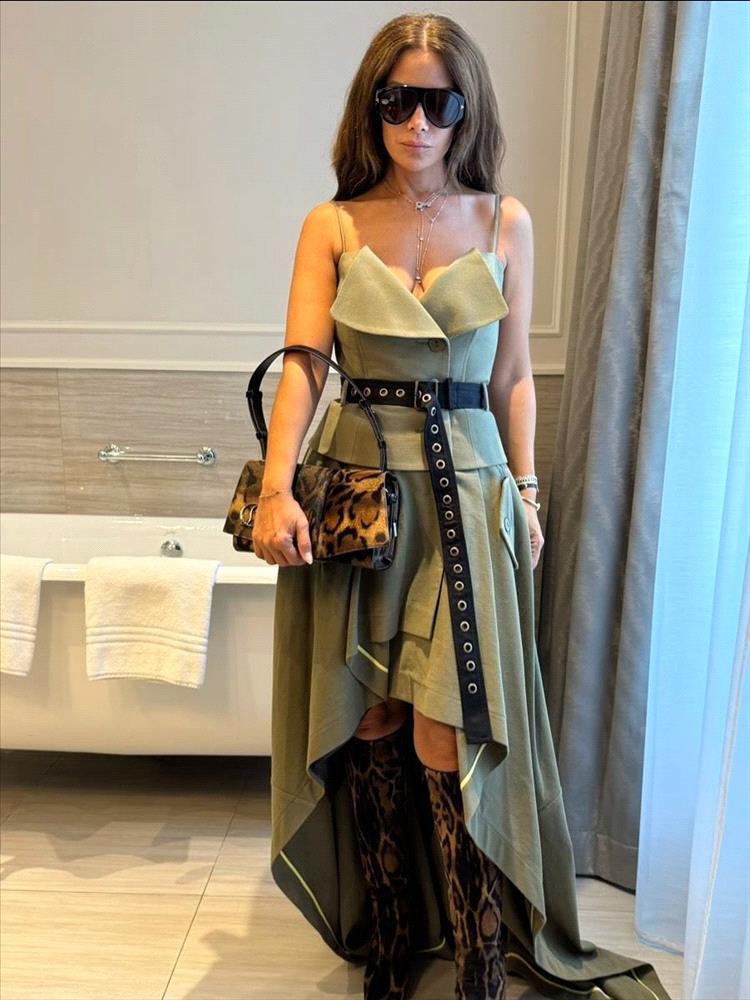 بملامح تجمع بين القوة والأنوثة، أطلّت صبا مبارك بفستان كاكي طويل مع كشكش يحمل طابعاً عسكرياً واضحاً. اكتملت الإطلالة بلمسات جريئة: حقيبة بطبعة الليوبارد وحزام أسود ملتفّ حول الخصر، مما أعطى اللوك طابعاً بوهيمياً قوياً، يعكس أسلوب صبا المتحرّر.