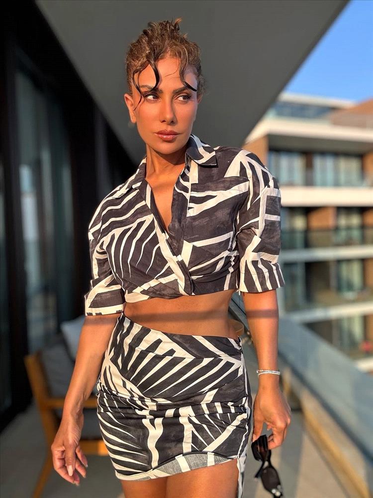 ظهرت صبا مبارك بلوك شبابي جريء يجمع بين القميص الكروب والتنورة الزيبرا القصيرة الضيّقة. هذا التنسيق يُبرز رشاقتها ويعكس الجرأة في اعتماد نقشة الزيبرا، إحدى أشهر صيحات الصيف، مع إبقاء الإطلالة متوازنة وغير مبالَغ فيها.