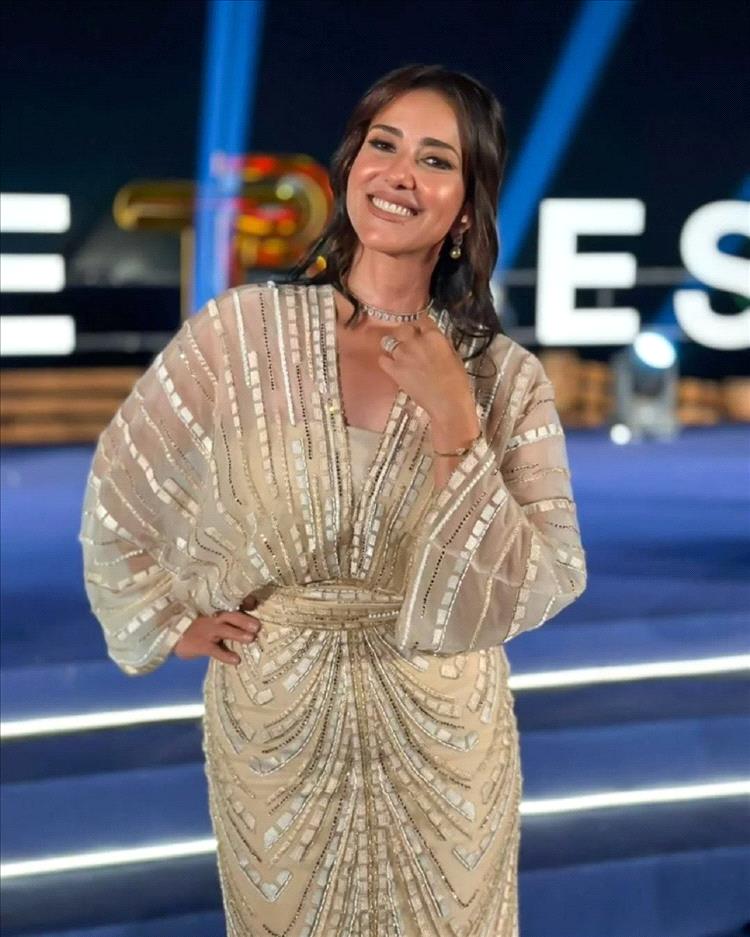 تألقت الفنانة حنان مطاوع بإطلالة هادئة وراقية في آن، من خلال فستان باللون البيج بقصة شرقية ناعمة. الأكمام جاءت بأسلوب Butterfly الذي أضفى حركة خفيفة ورومانسية على الإطلالة. كما زُيّن الفستان بتطريزات ناعمة تعكس جمال التفاصيل الشرقية الراقية، ما جعل إطلالتها مثالاً على الأناقة الهادئة والبعيدة عن المبالغة.