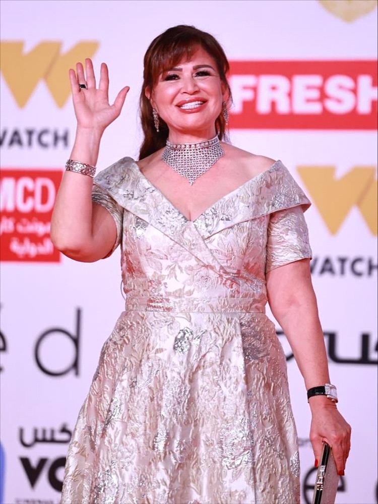 اختارت إلهام شاهين فستاناً من قماش البروكار المعروف بثرائه ولمعانه، مؤكدة مرة جديدة حرصها على الظهور بإطلالات تحمل طابعاً خاصاً بها. اتّسم التصميم بياقة عريضة تُبرز منطقة العنق، فيما جاءت التنورة الواسعة بطابع كلاسيكي يعكس فخامة القماش. ولفت الأنظار عقد ضخم متلألئ تناسب تماماً مع الكلاتش المختار، بينما جاءت تسريحة الشعر المرفوعة مع غرّة جانبية لتمنحها لمسة أنثوية ناعمة تكمّل فخامة الإطلالة.