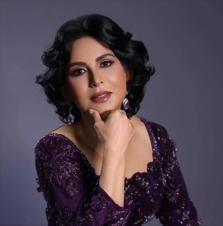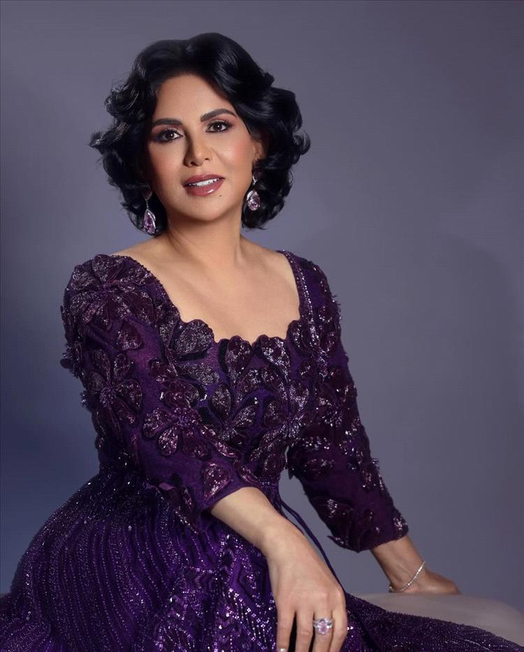 واختارت النجمة الخليجية فستاناً أنيقاً من اللون البنفسجي الغامق بقماش برّاق بالكامل، تميّز بقصّة ناعمة عند الصدر وبأكمام طويلة وبتصميم ضيّق من الأعلى، وينسدل من الأسفل بتنورة واسعة ومزيّنة بالترتر البرّاق، في إطلالة محتشمة وراقية.