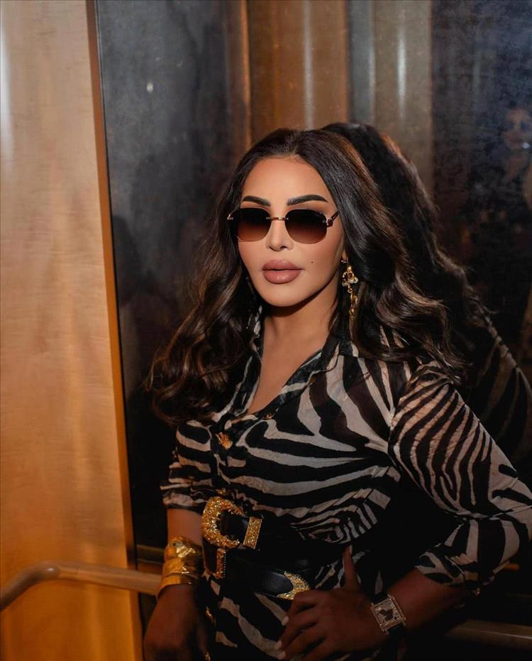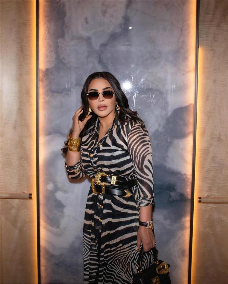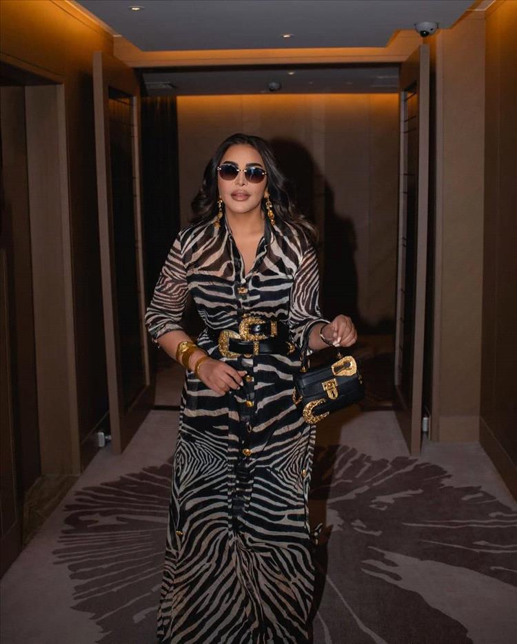 ونسّقت النجمة الإماراتية فستانها الأنيق الذي جاء على شكل قميص طويل بأزرار ذهبية كبيرة وأكمام طويلة بنقشة "الزيبرا" الفخمة، مع بنطال واسع ومريح وبأطراف ضيّقة مزيّنة بأزرار ذهبية أيضاً. وأبرزت خصرها بحزامين من الدار نفسها بإبزيمين من اللون الذهبي، وهو ما أضاف رونقاً خاصاً على إطلالتها المميزة.