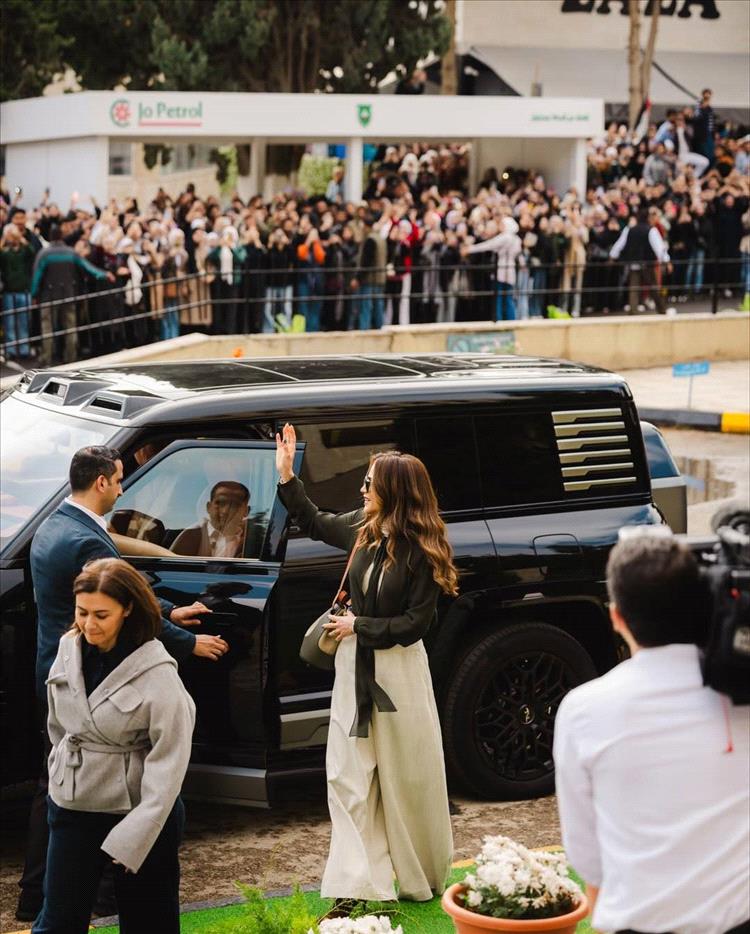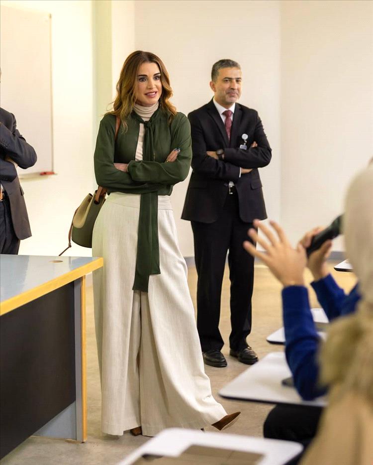 اختارت الملكة رانيا بلوزة من Maison Ala�a باللون الزيتوني، مع وشاح خفيف أضفى حركة وأناقة على المظهر. ونسّقت مع البلوزة بنطالاً واسع الأرجل من Palmer Harding بلون كريمي. ولإكمال الإطلالة، اعتمدت حقيبة من Loewe بتدرّجات الكريمي والأخضر، لتصبح قطعة فنية تربط بين كل عناصر المظهر. أما الحذاء فكان من Jennifer Chamandi.