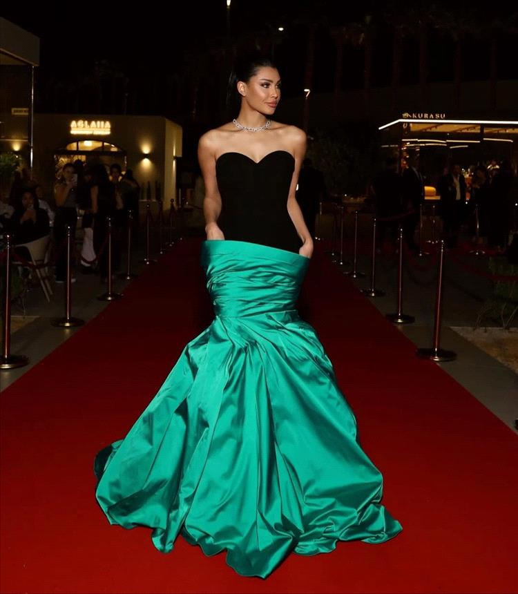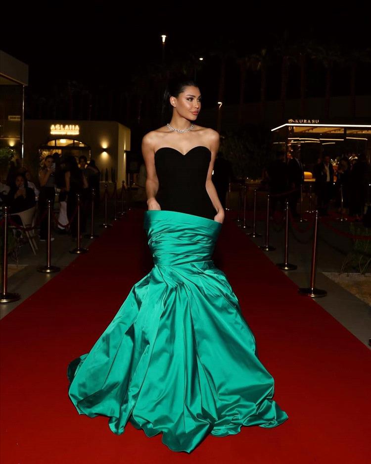 تألقت أميمة طالب بفستان مميز من تصميم خالد الغاشم، جمع بين القوة والرقي في آن. الجزء العلوي جاء باللون الأسود بقصّة "سترابلس" على شكل قلب، منحها إطلالة أنثوية ناعمة، بينما تميز الجزء السفلي باللون الأخضر بقماش مزمزم ومنفوش بأسلوب جذّاب أضفى حركة وأناقة على الإطلالة. مزيج الألوان والخامات جعل حضورها واحداً من الأكثر تميزاً في السهرة.