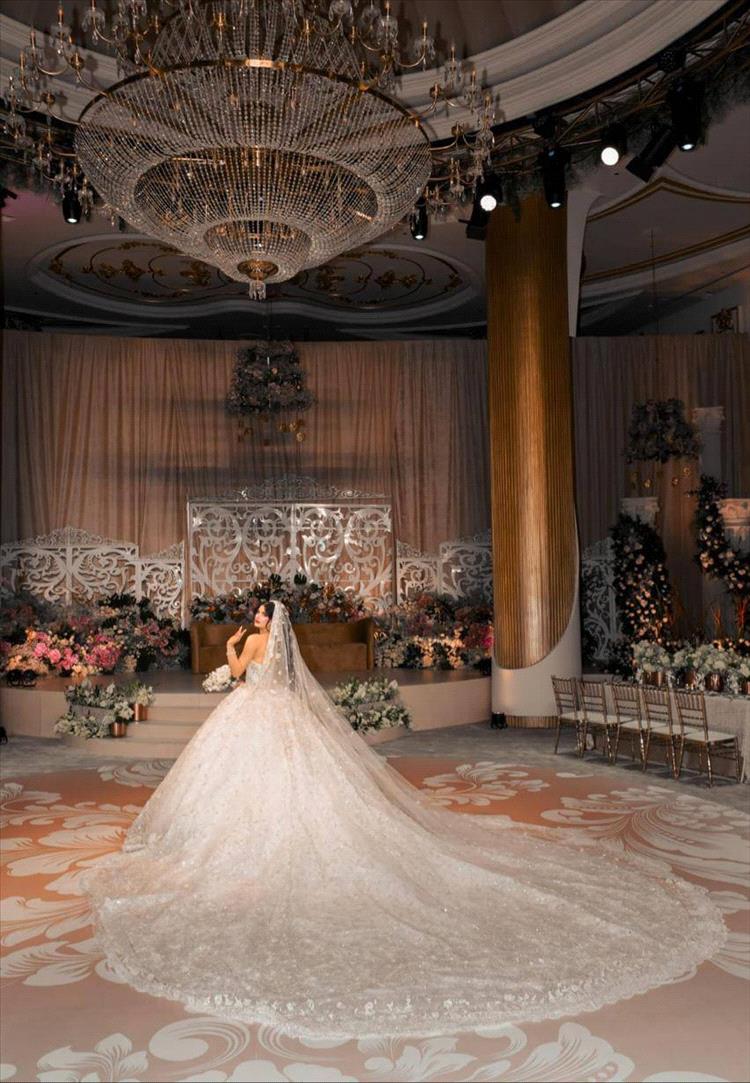 فستان العروس حمل توقيع دار Zuhair Murad Couture في تصميم يحاكي فخامة الأميرة العصرية، وينسجم مع هوية الحفل الملكية.