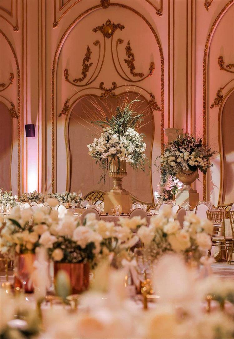 - تصميم خاص لمفارش الطاولات خيطت خصيصاً ليوم الزفاف، بما يتماشى مع ألوان الورود والإضاءة.