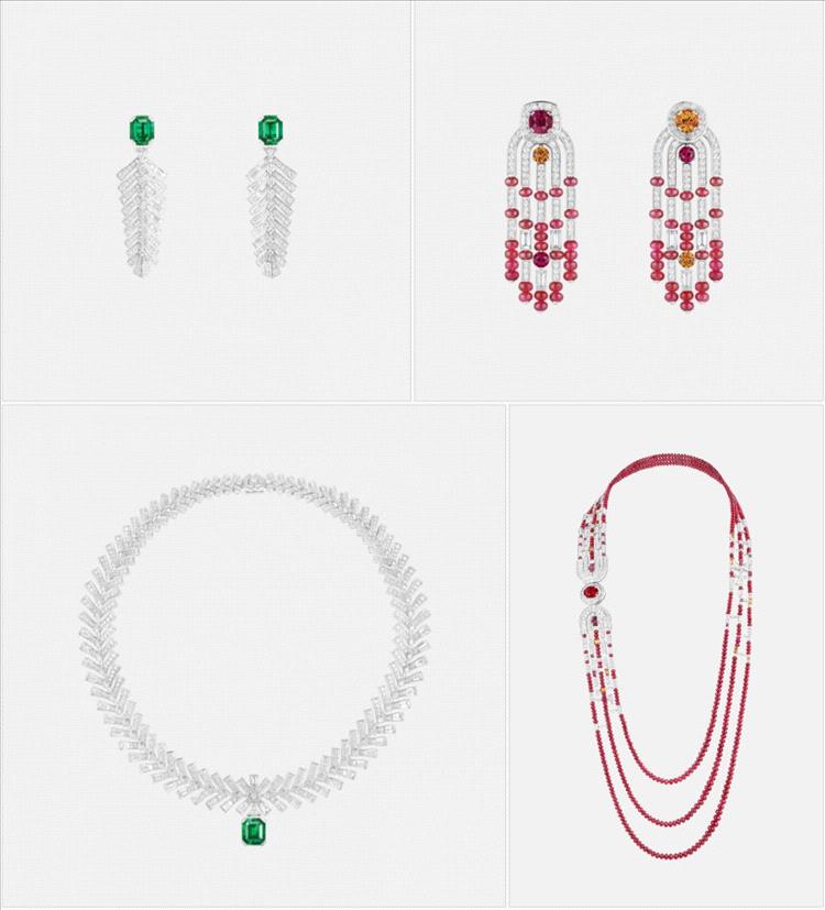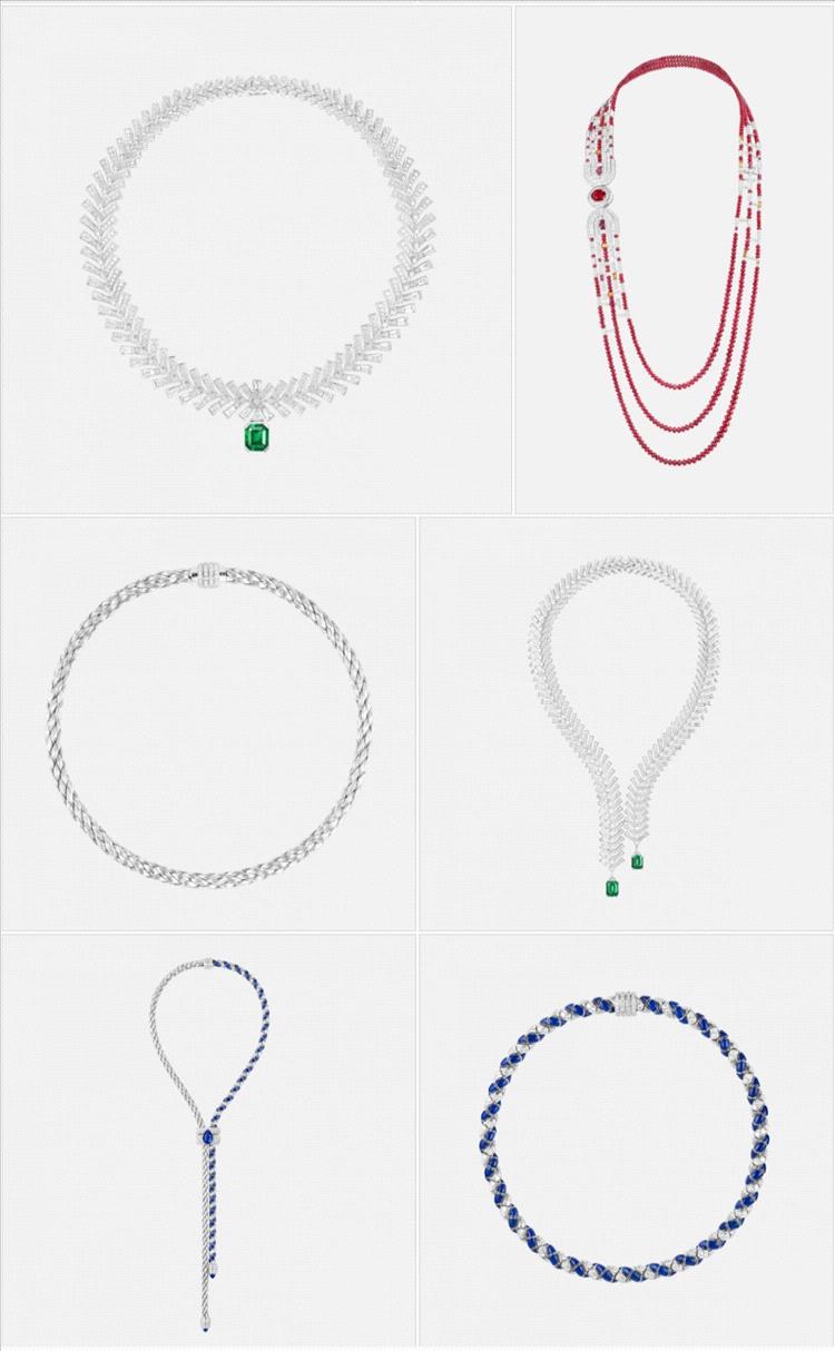 تلتفّ القلادة حول العنق متدلّية برشاقةٍ نحو تجويف الصدر، حيث تتفتح فروعها المتلألئة على شكل ألماساتٍ في انسيابية تفيض بالأناقة والأنوثة. لكن تبتعد هذه القلادة عن التناظر الكامل بين الجهتَين، إذ يُختتم كلٌّ من طرفَيها بحجر زمرّد، أحدهما بوزن 4.76 قراريط والآخر 3.73 قراريط.