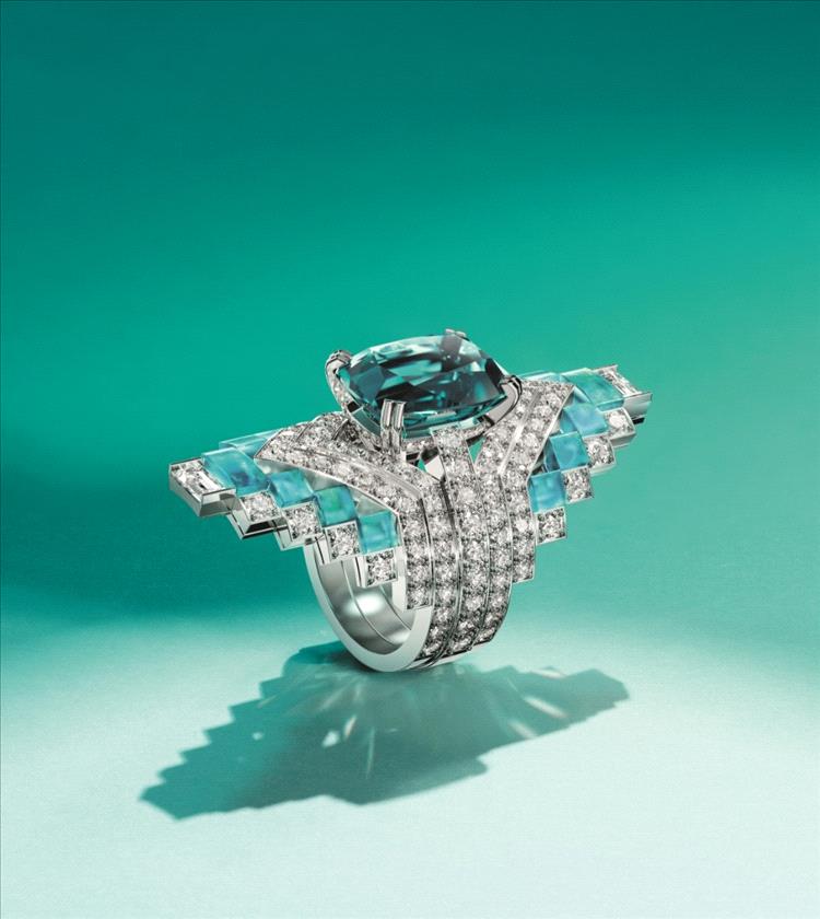 أمّا الخاتم الفخم المتألّق بثلاثة تصاميم في واحد، فيتربّع في وسطه حجر تورمالين بتقطيع الوسادة يزن 9.34 قراريط، تتماوج داخله ظلال الأزرق والأخضر كأنها أنفاس البحر. وتُطوّقه من الجانبين عناصر زخرفية مستوحاة من نقوش الأقمشة، تتألّف من شرائط مرصّعة بأحجار الفيروز وتُزيّنها أحجار أوبال بيضاء. يمكن ارتداء الخواتم الثلاثة معاً لإطلالة تحبس الأنفاس، أو فصلها إلى خاتمَين، أو وضع كلٍّ منها في إصبعٍ منفصل، ما يتيح ابتكار إطلالات لا حصر لها.