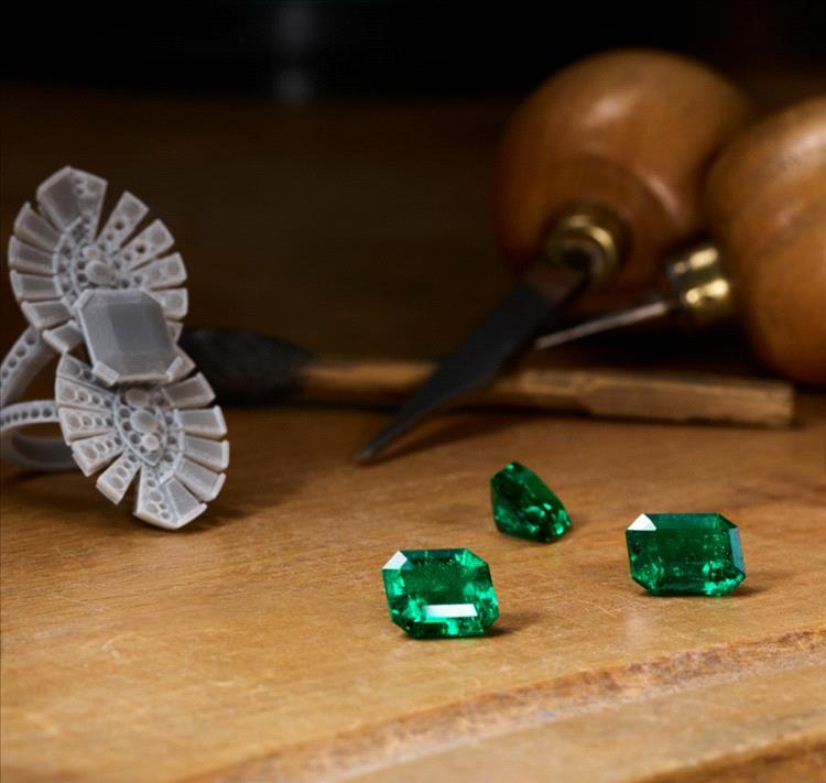 كذلك، يضمّ الطقم قلادة شوكر ثانية وسواراً أنيقاً بتصميمٍ مشابه، حيث يتوسّط القلادة حجر زمرّد بوزن 5.23 قراريط، والسوار حجر زمرّد بوزن 4.34 قراريط. ويكتمل الطقم بزوج أقراطٍ استثنائي، تحتضن كلّ فردةٍ منها حجراً من الزمرّد يتجاوز وزنه الـ 3 قراريط، تتراقص الأضواء عليه بسلاسةٍ مع كلّ حركة. واستلهاماً من تنوّع أشجار النخيل وسحر تماوج سعفها في الحديقة، صاغت الدار هذا الإلهام في خاتم كوكتيل متفرّد يجسّد روح الطبيعة بحِرفيّة آسرة. في هذا الإصدار، تتألّق سعفة النخيل بتصميمٍ دائريّ ينبسط برهافةٍ نحو الخارج، كأنها مروحة فنية تنساب فوق الإصبع بلمسةٍ تنبض بالحركة والجمال.