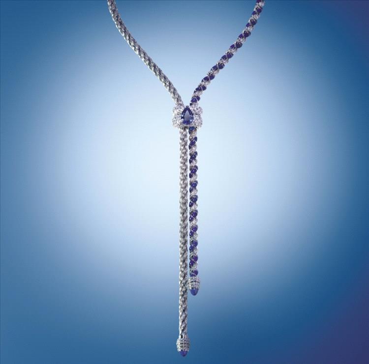 يحاكي هذا التصميم "كابل" البحّارة إذ ينفلت من الرافعة، متحولاً إلى قلادة طويلة تلتفّ على شكل حلقة عريضة. يتّسم تصميمها بدقّةٍ استثنائية، إذ يتباهى أحد جانبيها بشكل حبل مجدول من الذهب الأبيض، أمّا الجانب الآخر فيتألّق بتوليفة متناغمة من أحجار اللازورد والألماس الأبيض المرصوف. يجسّد هذا التصميم الحصري من دار FRED الانسيابية والحرية في الحركة، حيث يجتمع طرفا الكابل معاً بحلقة مزدوجة ومتحرّكة، تتيح تعديل طول القلادة بسلاسةٍ تامّة. يزيّن هذه الحلقة المرصّعة بالألماس حجرُ ياقوت سيلاني أزرق بتقطيعٍ كمثري، يزن 10.10 قراريط. وبلونه الأزرق العميق، يشكّل الخاتم دعوةً للغوص في أسرار البحر وأعماقه الساحرة. كما يمكن إزالة الحلقة لتنقسم القلادة إلى قطعتين قصيرتين، بحيث يحلو تنسيقها بمختلف الأساليب. يكتمل الطقم بسوارٍ يتمتع بتصميم مشابه.