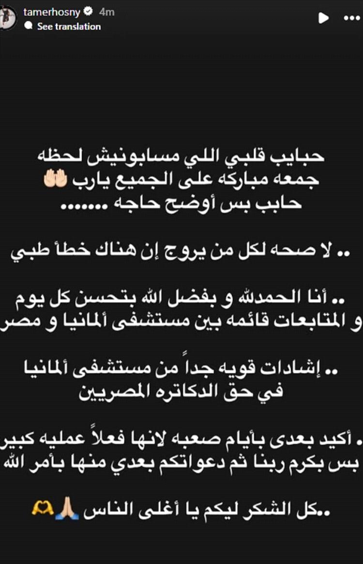 وكتب تامر معلقًا: "حبايب قلبي اللي مسابونيش لحظة جمعة مباركة على الجميع يارب، حابب بس أوضح حاجة، لا صحة لكل من يروج أن هناك خطأ طبي، أنا الحمد لله وبفضل الله بتحسن كل يوم والمتابعات قائمة بين مستشفى في ألمانيا ومصر".