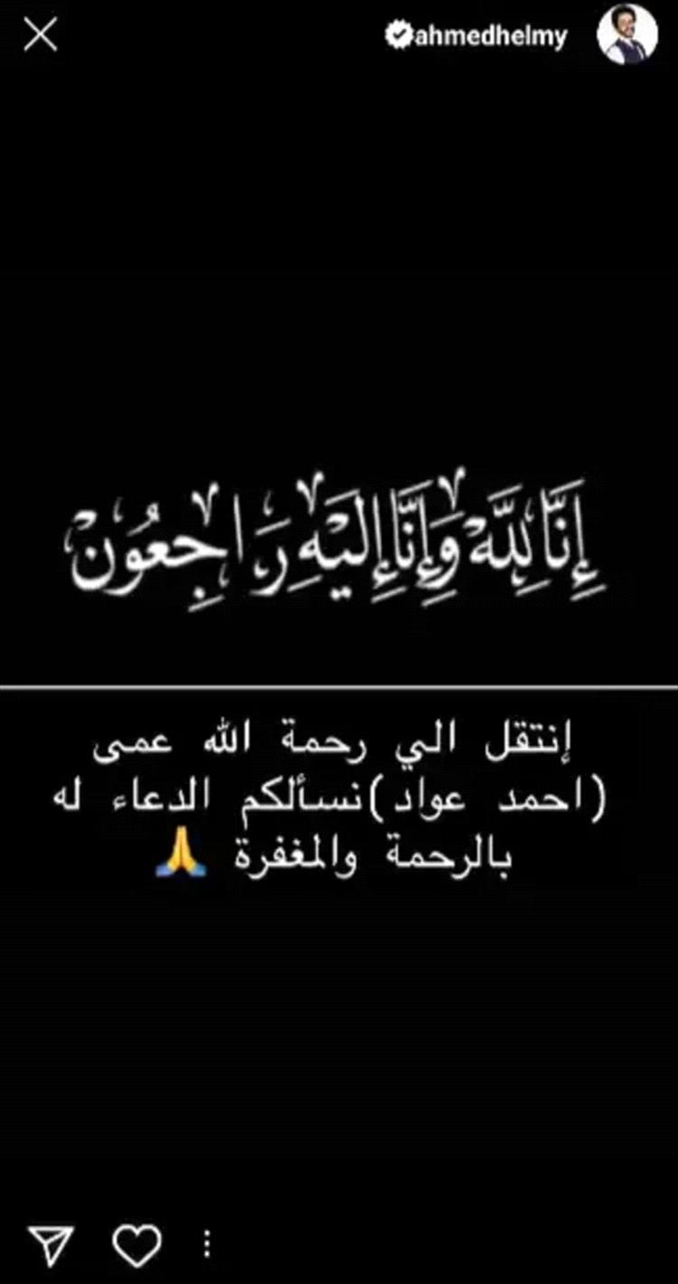وكتب حلمي في منشوره على "إنستغرام": "انتقل الى رحمة الله عمي أحمد عواد، نسألكم الدعاء له بالرحمة والمغفرة".
