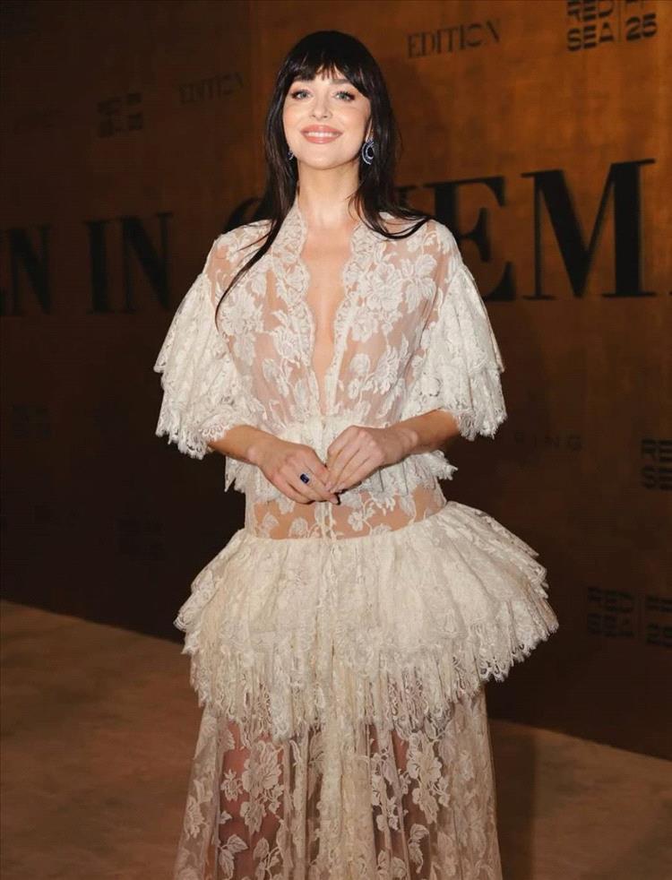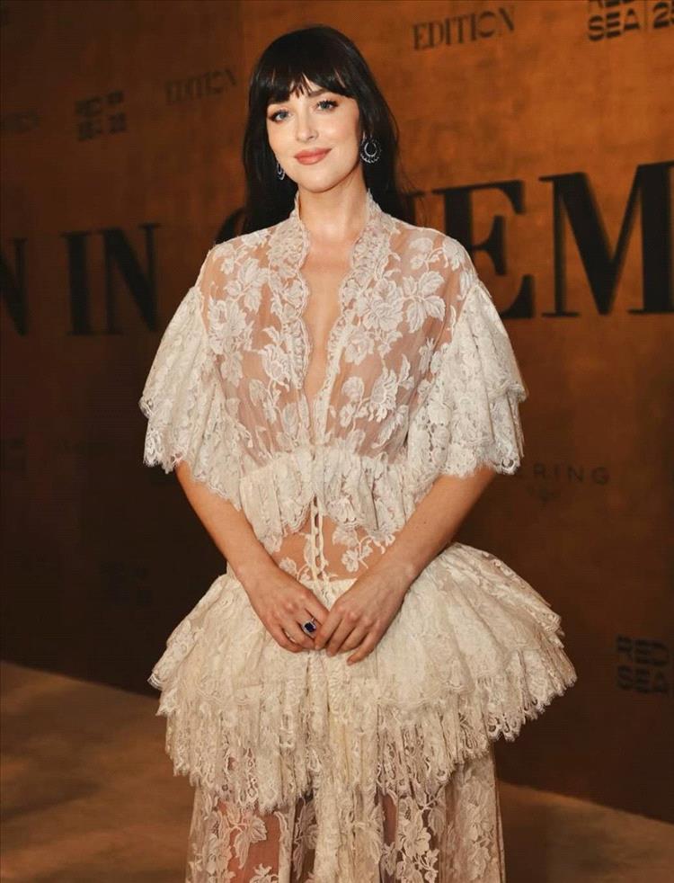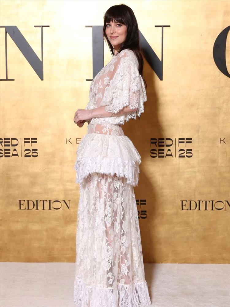 تألقت النجمة داكوتا جونسون خلال مشاركتها في فعالية "المرأة في السينما"على مهرجان البحر الأحمر السينمائي الدولي في جدة، بفستان أبيض شفاف من الدانتيل الفخم.