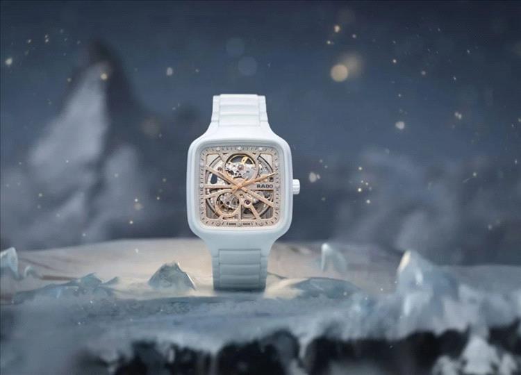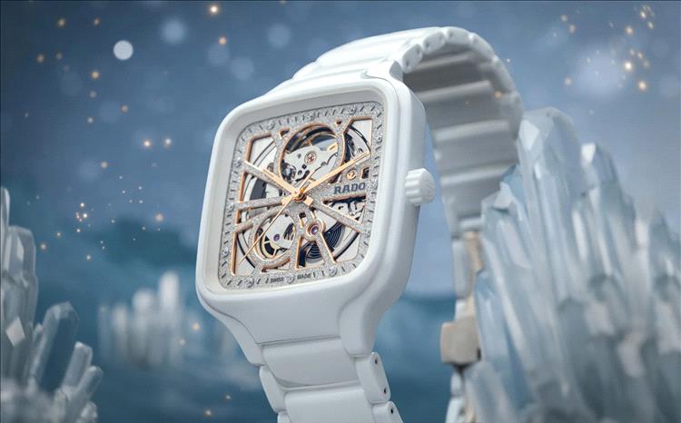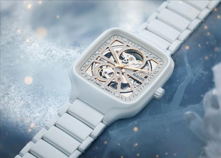 يشكل عالم من الكريستال والثلج والجليد خلفية شتوية لساعة True Square Open Heart. يُجسّد اللون الأبيض النقي لعلبة الساعة وتاج ضبطها وسوارها المصنوع من السيراميك المصقول فائق التقنية، إلى جانب التشطيب الحبيبي البراق على قرصها الروديومي، وهو تصميم مستوحى من تقنية تصنيع حصرية لدى Rado ومؤشراتها الماسية الاثني عشر، مشهداً بصريا يحاكي بريق رقاقات الثلج ولمسة الهواء الجبلي البارد.