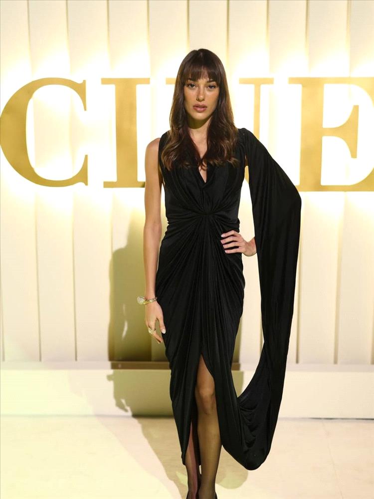 جذبت ديلان دينيز الأنظار بفستان أسود ضيّق بقصّة مزمزمة تزيد من جاذبية القوام. جاء الفستان بياقة V جريئة، مع فُتحة أمامية تضيف توازناً بين الأنوثة والرقي، بينما منحها شال جانبي متصل بالفستان مظهراً درامياً وأنيقاً.