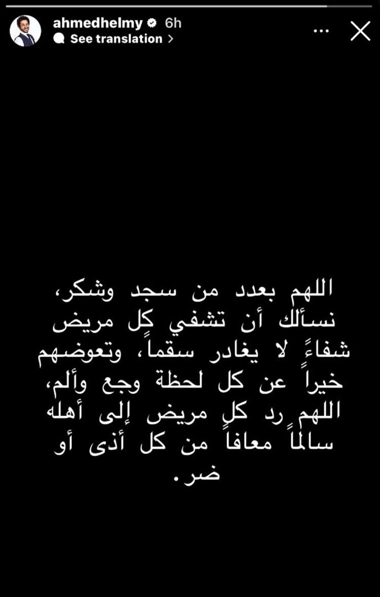 أثار الفنان أحمد حلمي الحيرة والتساؤلات بين جمهوره بسبب رسالة غامضة نشرها عبر خاصية القصص المصوّرة الملحقة بحسابه الخاص في "إنستغرام"، وكتب فيها دعاء لشفاء المريض، الأمر الذي دفع عدداً من متابعيه للتساؤل عن السبب، فيما عبّر آخرون عن قلقهم على حالته الصحية.