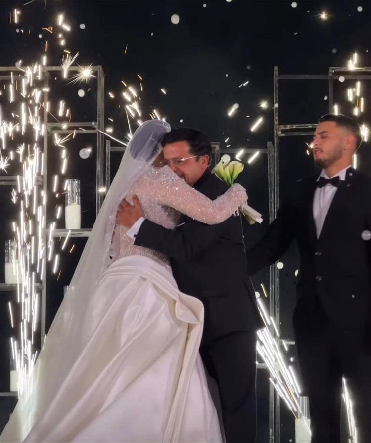 وبدأ الحفل بمراسم تسليم محمد هنيدي ابنته لعريسها وسط تصفيق من الحضور، ثم رقص معها على أنغام أغنية "بنت أبويا"، وسط دموع العروس التي لم تتمالك نفسها وانهمرت في البكاء بين أحضان والدها، الذي لم يتمالك دموعه هو الآخر، ثم بعدها رقصت العروس مع عريسها.