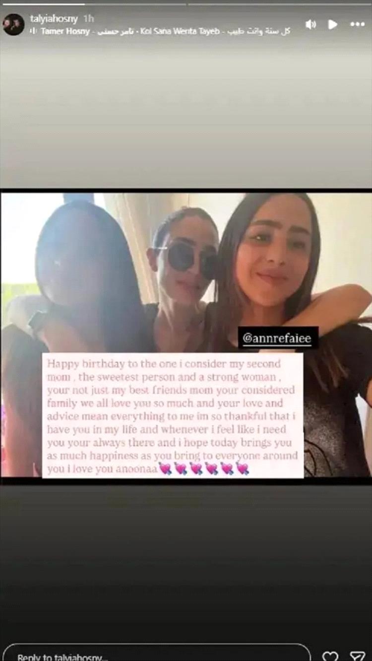 نشرت تاليا ابنة النجم تامر حسني على خاصية القصص المصورة الملحقة على حسابها الخاص بـ"إنستغرام" رسالة عاطفية وجهتها إلى مصممة الأزياء آن الرفاعي، طليقة الفنان كريم محمود عبد العزيز، عبّرت فيها عن تقديرها الكبير لها، بمناسبة عيد ميلادها، ما أثار تفاعلًا واسعًا عبر مواقع التواصل الاجتماعي.