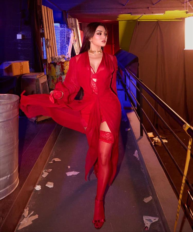 نسّقت "الديفا" الفستان مع جوارب حمراء عالية تتخطّى الركبة مزيّنة بحواف من الدانتيل، ما أضفى بُعداً جريئاً ولافتاً على الإطلالة. واختارت صندلاً أحمر متناغماً مع كامل "اللوك"، إلى جانب روب أحمر بقماش منسدل أضاف حركة وأناقة ناعمة، ورفع مستوى الإطلالة من الجريء إلى الفاخر. الإطلالة كلها موقّعة من علامة "دولتشي أند غابانا" Dolce & Gabbana.