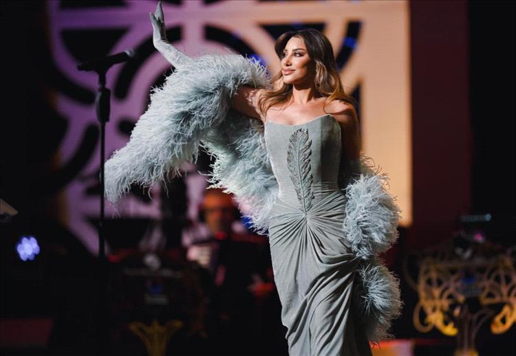 وتألقت "شمس الأغنية العربية" بفستان من المخمل الفخم باللون الرمادي الساحر بتصميم ضيق ومجسم يبرز رشاقتها وجسمها الممشوق،واختارت التصميم المميز من مجموعة المصمم اللبناني رامي قاضي، وتميز التصميم بقصته المفتوحة عند منطقة الصدر مع تطريزات فضية لافتة في منتصف الفستان على شكل ريشة، وينسدل عند الورك بزمزمات بارزة وبتنورة طويلة وأنيقة.
