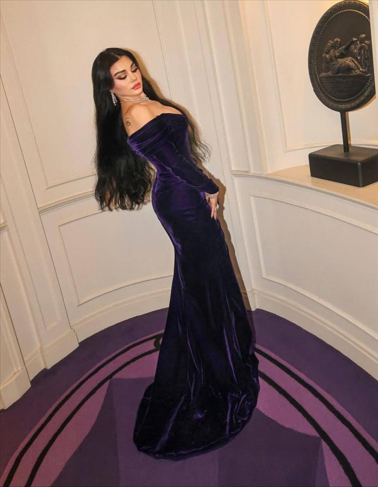 واختارت النجمة اللبنانية لهذه المناسبة فستاناً من المخمل الفخم باللون البنفسجي الغامق (الموف)، ورغم بساطة التصميم وخلوّه من الشك أو التطريزات إلا أنه تميّز بقصّته المجسّمة التي تبرز رشاقتها، وجاء مكشوف الكتفين والصدر وضيقاً من الأعلى، وينسدل بنعومة بتنورة واسعة مع زمزمة خفيفة عند الخصر وفُتحة ساق عالية جداً.