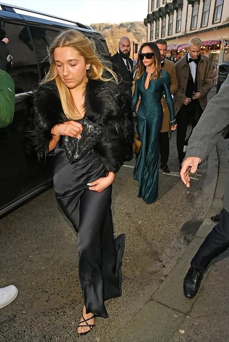 وفي صورٍ أخرى، ظهرت فيكتوريا وهي تحمل سترةً من الفرو وحقيبة يد ذهبية، بينما ارتدى زوجها بدلة توكسيدو سوداء مع معطف بلون الجمل. كما حضرت ابنتهما هاربر حفل الزفاف، مرتديةً فستانًا أسود من الساتان مع شال من الفرو، وحملت حقيبة يد من بوتيغا فينيتا.
