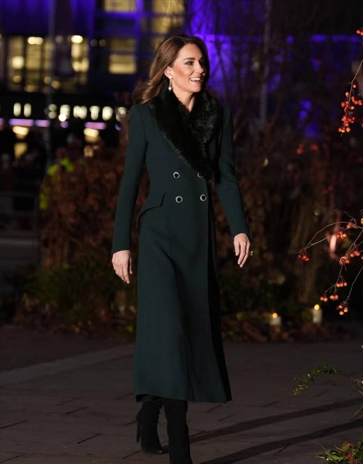في المناسبات المسائية، اختارت كيت فستاناً طويلاً من المخمل الأخضر بقصّة "أوف–شولدر" ناعمة. هذا التصميم جمع بين الفخامة والأنوثة الهادئة، وأبرز ذوقها الراقي في اختيار الأقمشة الشتوية الفاخرة من دون مبالغة.