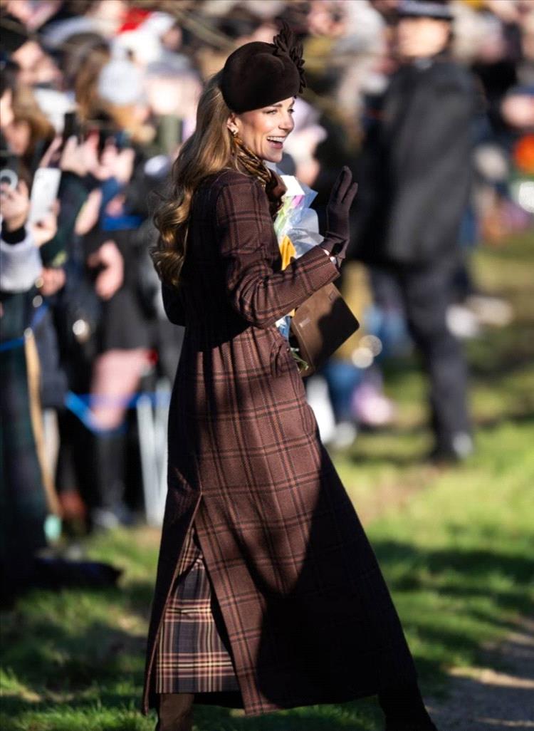 اختارت كيت معطفاً طويلاً باللون البنّي مزيناً بنقشة المربعات الكلاسيكية، في إطلالة تعكس الذوق البريطاني الأصيل. هذا المعطف جاء بقصة أنيقة ومحتشمة، ما جعله مثالياً للإطلالات النهارية والرسمية، وأثبت أن النقشات الكلاسيكية لا تفقد جاذبيتها مع مرور الزمن.