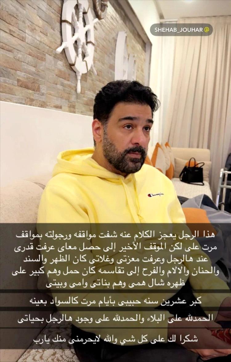 وحرصت إلهام أيضاً على توجيه رسالة خاصة الى زوجها الفنان شهاب جوهر لوقوفه بجانبها في هذه المحنة الصعبة، ونشرت صورة له من داخل المنزل وأرفقتها بتعليق كتبت فيه: "هذا الرجل يعجز الكلام عن وصفه، شفت رجولته بمواقف مرت عليّ لكن بالموقف الأخير اللي حصل معي عرفت قدري عند هالرجل وعرفت معزّتي وغلاي كل الظهر والسند والحنان والألم والفرح اللي نتقاسمه".