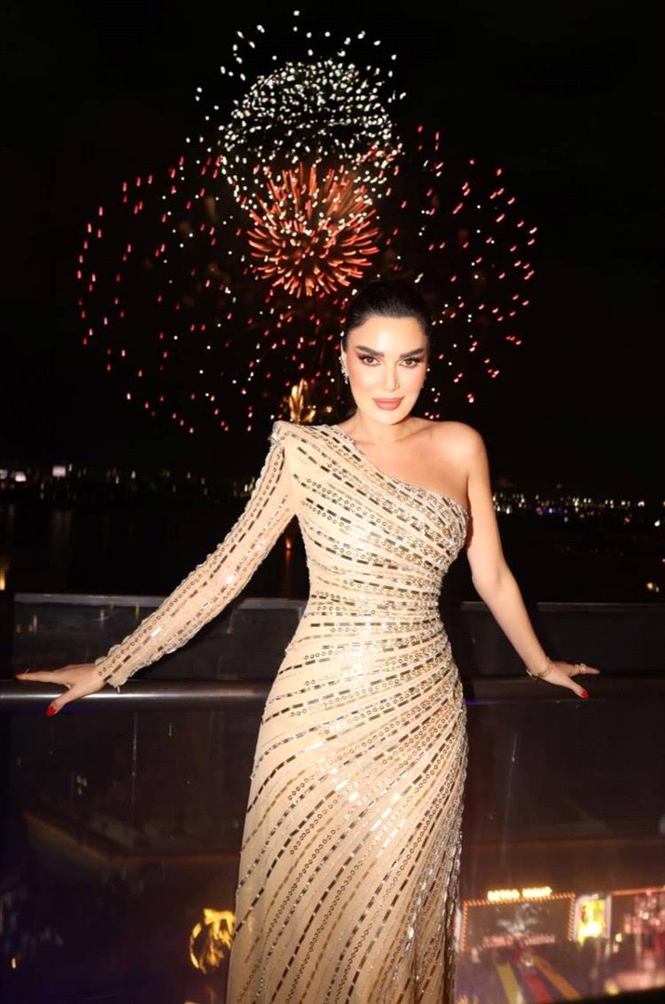 أرادت سيرين عبد النور أن تستقبل العام الجديد بإطلالة أنثوية راقية، فظهرت بفستان من توقيع طوني ورد بقصّة الكتف الواحدة. اللون البيج المزيّن بتطريزات ذهبية وفضّية منح التصميم حضوراً راقياً، فيما جاءت القصة الضيّقة والطويلة لتبرز قوامها بأناقة واضحة. واعتمادها تسريحة شعر مرفوعة مع مكياج قوي بلمسات برونزية أضفى توازناً مثالياً بين الرقي والقوة.