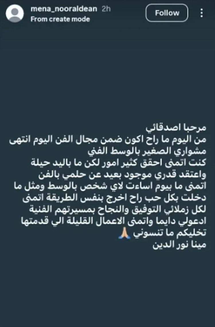 وشاركت الممثلة العراقية متابعيها عبر خاصية الستوربز على إنستغرام بمنشور غامض أعلنت من خلاله اعتزالها الفن وكتبت رسالة عفوية جاء فيها: "من اليوم ما رح أكون ضمن مجال الفن، اليوم انتهى مشواري الصغير بالوسط الفني كنت اتمنى أحقق كثير أمور ولكن ما باليد حيلة، أعتقد قدري موجود بعيد عن حلمي بالفن".