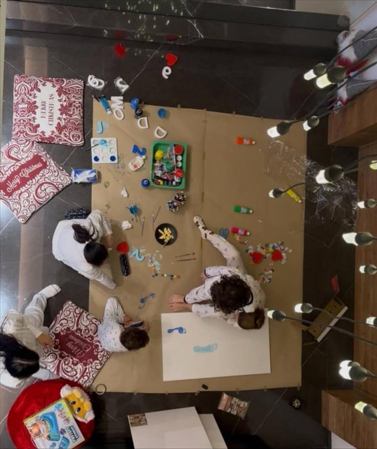 وحرصت ميريام على إلتقاط الصور من مكان عالٍ لإخفاء ملامح زوجها السيد ظاني متري، الذي شارك معها في النشاط ومشى معها ليطبعا شكل قدميهما ويديهما مع قدمي الطفلين والأحرف الأولى من اسمائهم وتزيينها بما يتلاءم مع رغبات جابدن ودايف.