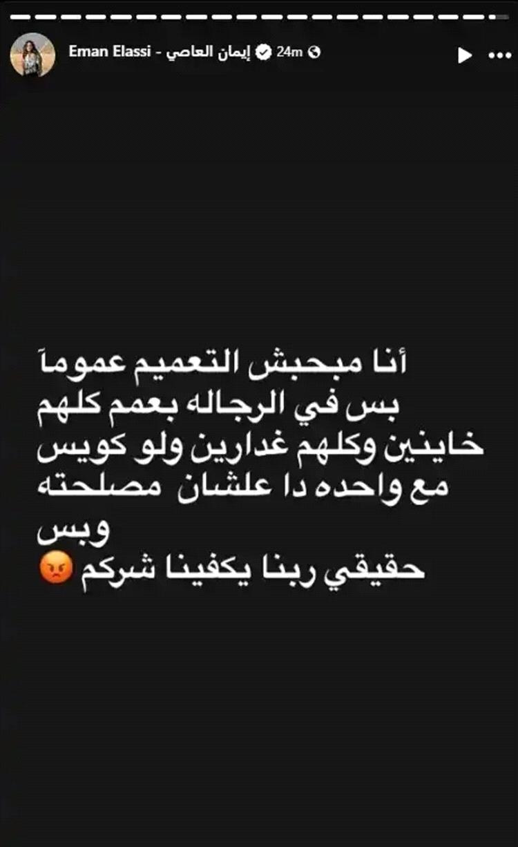 نشرت الفنانة إيمان العاصي عبر خاصية القصص المصوّرة الملحقة بحسابها الخاص في "إنستغرام" رسالة شنّت من خلالها هجوماً عنيفاً على عموم الرجال، مؤكدةً أنهم جميعاً خائنون وغدّارون.