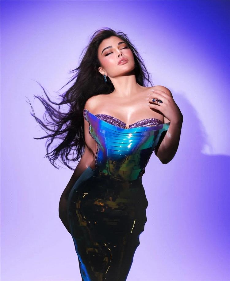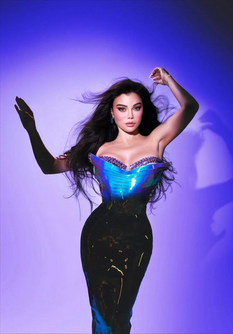 وانتقل التصميم بسلاسة إلى كورسيه منحوت بقصة "سترابلس" ذات لمسة معدنية، تداخلت فيه درجات لونية متناغمة بين الأزرق والفضّي والبنفسجي، ما منح الفستان بُعداً عصرياً ولافتاً. أما القصة السفلية فجاءت ضيّقة، زادت من أناقة التصميم وأبرزت رشاقة القوام بأسلوب راقٍ وجريء في آن واحد.