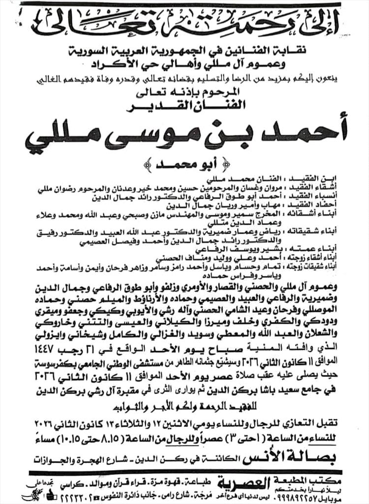 وأفادت مصادر إعلامية سورية بأن أحمد مللي أُدخل إلى غرفة العناية المركزة في "المستشفى الوطني" بدمشق، بعد تدهور مفاجئ في حالته الصحية خلال الساعات الأخيرة، قبل أن يفارق الحياة.