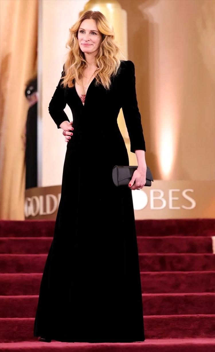 تألقت جوليا روبرتس بفستان أسود مخصّص من Armani Priv�، بياقة V وقصة A-Line ضيّقة من الأعلى وواسعة من الأسفل، مكتملةً بمجوهرات Swarovski التي أضافت لمسة فخامة مدروسة.