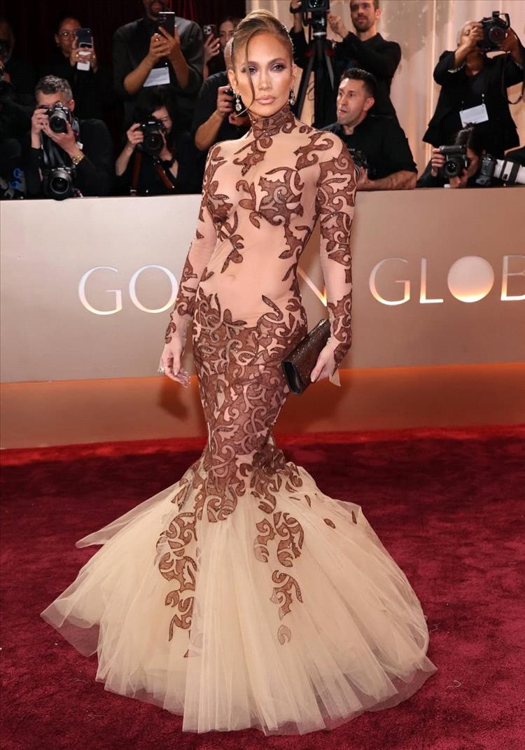 اختارت جينيفر لوبيز فستاناً فينتيج من Jean-Louis Scherrer يعكس الطابع الكلاسيكي للموضة، بلون شفّاف محايد مزيّن برسومات بنّية فنية. الجزء السفلي جاء بقصّة حورية البحر، تضفي حركة ورُقياً على التصميم. أكملت الإطلالة مع تسريحة شعر مرفوعة ومكياج برونزي وحذاء من Christian Louboutin، لتكون من أبرز المحطات على السجادة الحمراء.