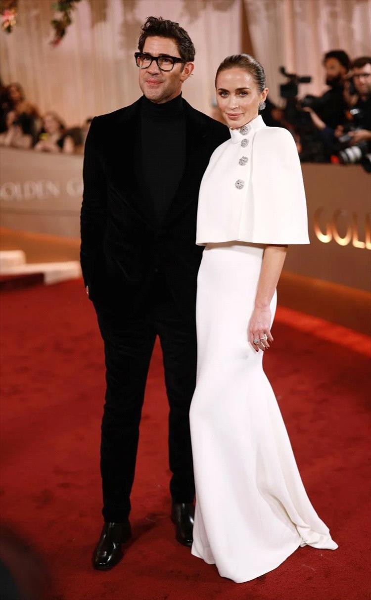 اختارت إميلي بلانت فستاناً أسود طويلاً بقصة ضيّقة تتسع في الأسفل، مع كاب نصفي أنيق من Louis Vuitton.