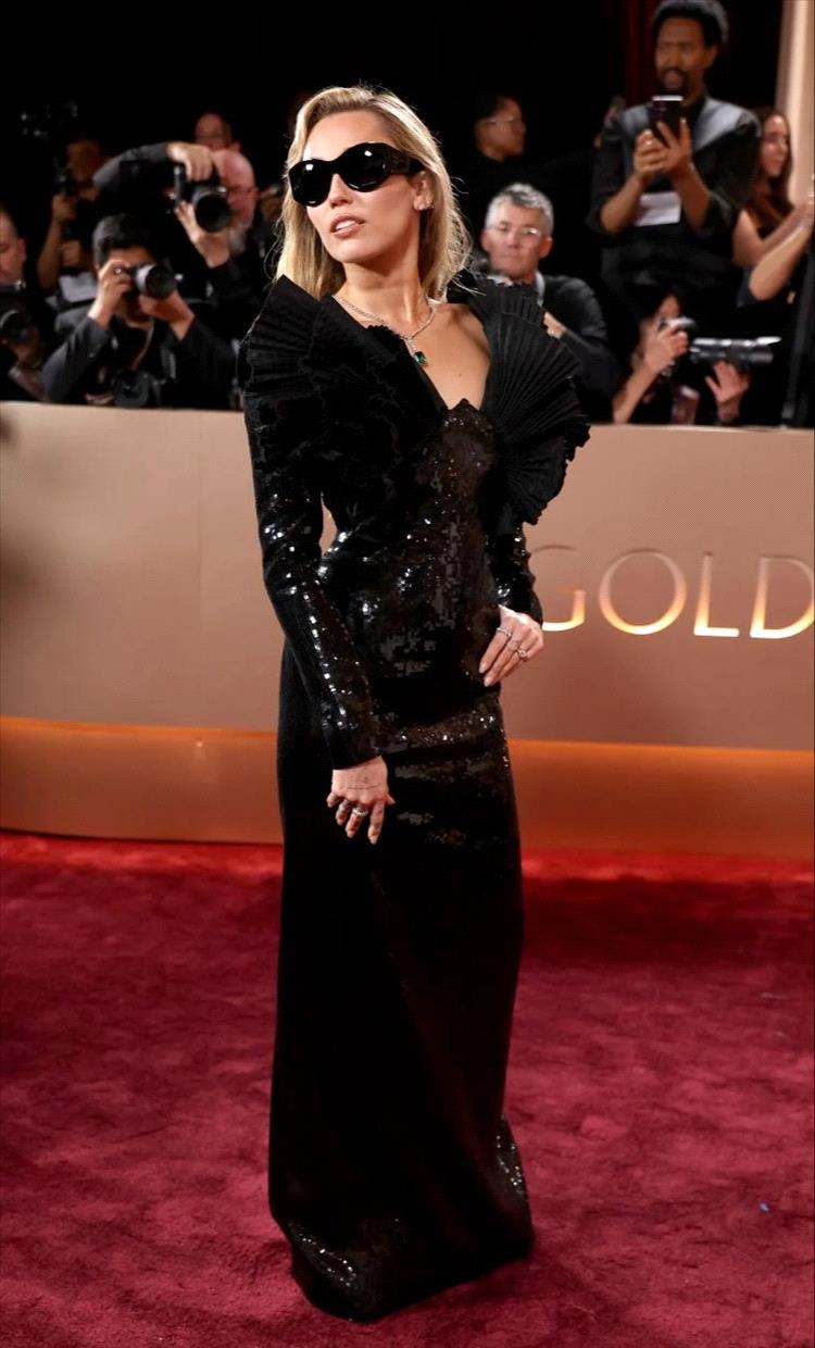قدّمت مايلي سايرس إطلالة درامية بامتياز بفستان أسود مرصّع بالترتر من Saint Laurent. التفاصيل البارزة عند الصدر والنظّارات الشمسية السوداء زادت من حدّة التصميم، ليكون اختيارها من أكثر الإطلالات جرأةً على السجادة الحمراء.