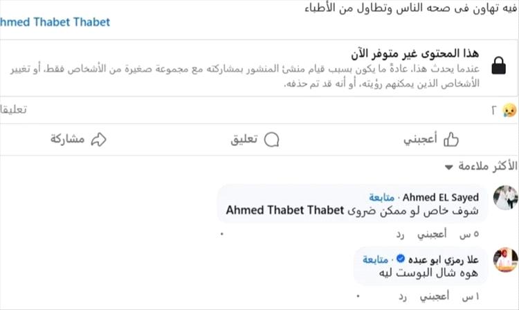 وكتب أحمد ثابت، عبر حسابه الشخصي بموقع "فيسبوك"، منشورًا استغاث فيه قائلاً: "في مصيبة حاصلة مع أمي في مستشفى بالمهندسين بالجيزة، ومفيش تمريض وبيقول لأمي يا مجنونة، وسايب أمي طول الليل من غير غيار والبول مغرقها طول الليل، والدكتور مربط إيدها يمين وشمال زي المجرمين، والدكتور يسيبني ويمشي وجالها انهيار عصبي".