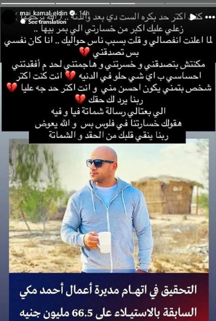 علّقت مي كمال الدين، طليقة الفنان أحمد مكي، على واقعة استيلاء مديرة أعماله على حساباته في البنوك والتي تخطت 66 مليون جنيه، حيث نشرت على خاصية القصص المصورة الملحقة على حسابها الخاص بـ"إنستغرام" صورة لخبر التحقيق مع مديرة أعمال أحمد مكي في اتهامها بالاستيلاء على 66 مليون جنيه، وعلّقت عليها موجهة رسالة الى طليقها قائلة: "كنت أكثر حد بيكره الست دي بعد والدته الله يرحمها.. زعلي عليك أكبر من خسارتي اللي بمر بيها لما أعلنت انفصالي وقلت بسبب ناس حواليك.. أنا كان نفسي بس تصدقني؟؟ مكنتش بتصدقني وخسرتني وهاجمتني لحد ما أفقدتني إحساسي بأي شيء حلو في الدنيا.. أنت كنت أكثر شخص بتمنى يكون أحسن مني وأنت أكثر حد جه عليا".