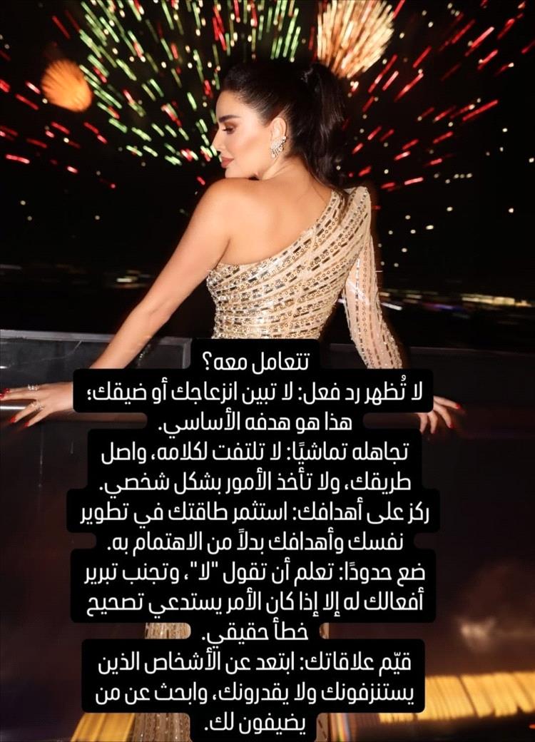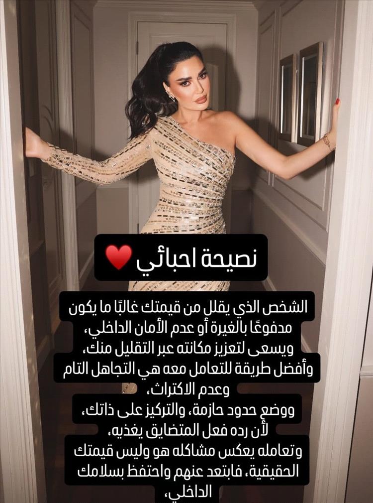 ونشرت النجمة اللبنانية عبر خاصية "الستوريز" في "إنستغرام" صوراً لها وأرفقتها بالتعليق: "نصيحة أحبائي، الشخص الذي يقلّل من قيمتك غالباً ما يكون مدفوعاً بالغيرة أو عدم الأمان الداخلي، ويسعى لتعزيز مكانته عبر التقليل منك، وأفضل طريقة للتعامل معه هي التجاهل التام ووضع حدود حازمة والتركيز على ذاتك، لأن ردة فعل المتضايق تغذّيه وتعامله يعكس مشاكله...".