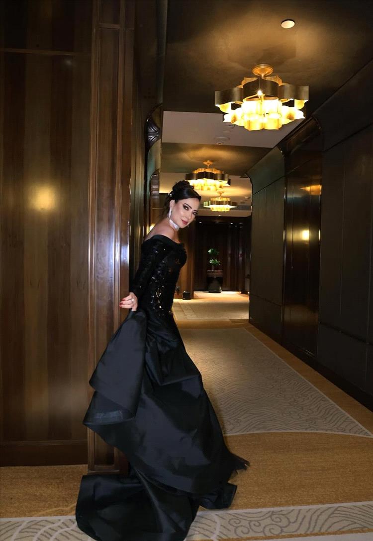 أما النجمة أمل عرفة فاختارت فستاناً مناعماً باللون الأسود بتصميم يمزج بين الكلاسيكية والتفاصيل الأنيقة، وجاء مكشوف عند الكتفين، بأكمام طويلة وبصيحة الترتر البراقة التي غطت كامل الفستان، وأضيف إليه من الخلف ذيل ضخم منح اطلالتها المزيد من اللمسات الدرامية الملفتة.